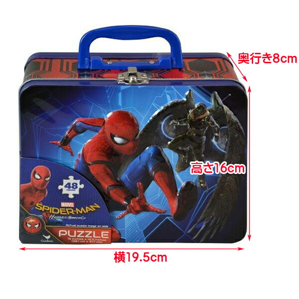 【商品詳細】 スパイダーマンのブリキボックス&パズル付き! 映画「スパイダーマン ホームカミング」のイラストが描かれた、ブリキボックス! イラストや文字などエンボス加工されていて、立体的に感じられる作り! ボックスの中には、48ピースの「パズル」が入っています! ティンボックスは日本ではおもちゃを入れる箱としての使用が多いですが、海外ではサンドイッチと飲み物を入れたランチボックスとしてもよく使われています! 他では見かけることの少ないブリキボックス! スパイダーマンファン、MARVEL、アメコミ好きにはたまらない! 飾るだけでも楽しめるオススメ商品です! ※輸入品の為、細かなキズ、ヘコミ等ある場合がございます。