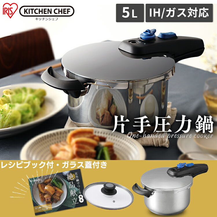 ■商品サイズ(cm)幅約42.3×奥行約21.7×高さ約20.3■製品質量約2.4kg■満水容量5L■材質本体:ステンレス鋼(クロム18%、ニッケル8%)はり底:ステンレス鋼(クロム16%)、底の厚さ4.5mm(はり底を含む)■圧力切替2段階圧力切り替え式■対応熱源IH・ガス対応■セット内容鍋・圧力蓋・中かご・ガラス蓋・レシピブック「圧力鍋=難しい」のイメージ軽減!開閉が簡単!開閉ボタンを押してスライドするだけ。