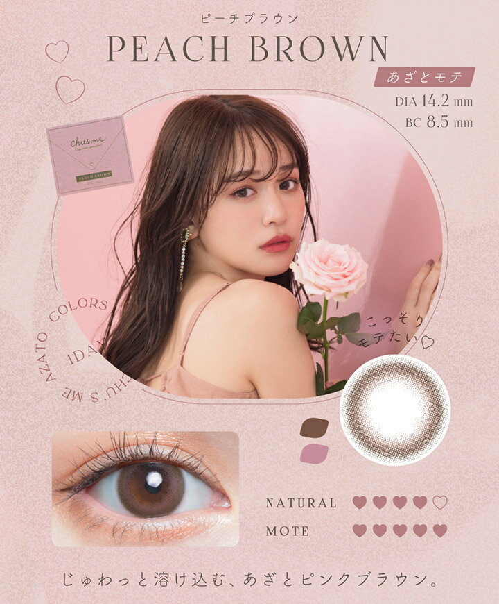 メール便-全国送料無料 不在が多い方におススメ!自宅のポストへ配達 Chu's me 1day 商品名 チューズミー カラー ピーチブラウン 入数 1箱10枚入り 使用期限 1日使い捨て 度数(POWER) 度なし(±0.00) -0.75~-5.00(-0.25ステップ) -5.50~-10.00(-0.50ステップ) 直径(DIA) 14.2mm 着色外径 13.5mm ベースカーブ(BC) 8.5mm 含水率 58% 製造方法 キャストモールド製法 種別 度あり カラコン 度入り カラーコンタクト サークルレンズ 製造販売元 Pegavision Japan株式会社 製造国 台湾 医療機器承認番号 22800BZI00037A01 販売業者 株式会社T-Garden 広告文責 TKシアン株式会社【CiACON シアコン】 高度管理医療機器等販売業 第2450179号【10枚入】チューズミー ピーチブラウン ワンデー(Chu's me 1day)
