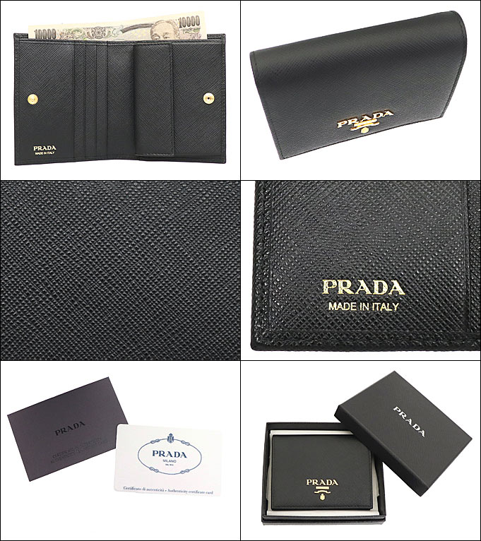 ●【プラダ PRADA】 サフィアーノ レザー メタル レタリング ロゴ バイフォールド コンパクト ウォレット 名称SAFFIANO METAL PORTAF.VERTI.PICCOLO 種類 小物/財布/二つ折り財布 サイズ 横幅:11.5cm 高さ:9cm マチ:2cm 重さ:80g 仕様間口:ホックボタン開閉 内部:札入れ×1 カード入れ×3 ポケット×2 小銭入れ×1 素材レザー カラー ネロ F0002 NERO 【金具の色】ゴールド 型番 1MV204 QWA 付属品 ギャランティーカード 純正BOX ※付属の箱について海外からの輸送中にキズ、はがれ等の損傷がある場合がございますので予めご了承下さい。