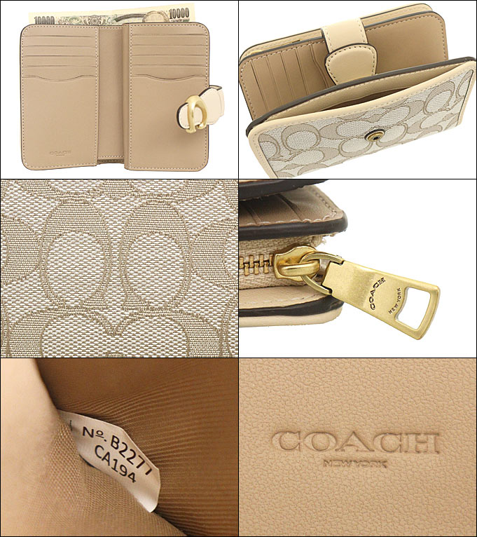 ●【コーチ COACH】 タビー シグネチャー ジャガード レザー ミディアム ウォレット 名称SIG JCD TBY MDM WALL 種類 小物/財布/二つ折り財布 サイズ 横幅:13.5cm 高さ:9cm マチ:3cm 重さ:120g 仕様間口:ホック付ベルト開閉 前面:オープンポケット×1 内部:札入れ×1 カード入れ×10 ポケット×3 背面:小銭入れ 素材キャンバス×レザー カラー ストーン×アイボリー B4SHG 【金具の色】アンティークゴールド 型番 CA194 付属品 なし 【2022 秋冬 新作】【2022AW】 コーチ COACHの財布(二つ折り財布)です。
